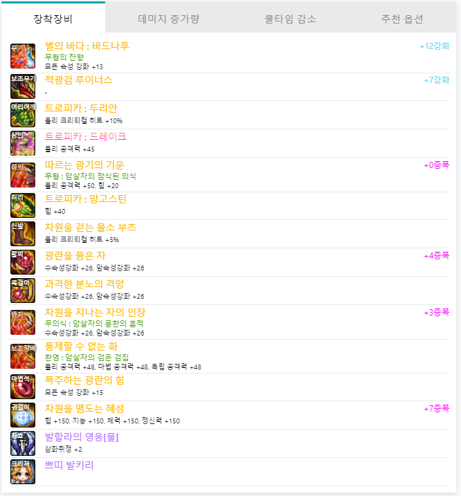 그래서 잔향 극옵도 무난하게 맞춰줄수 있었고, 장비도 올 최상급으로 맞춰줬다.