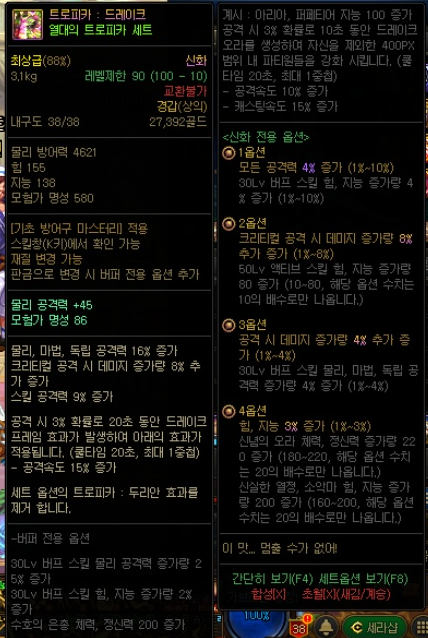 다행히 맞추긴 했는데 마지막 1옵션을 신화 전용 칼박을 한 5개정도 돌려도 안떠서 결국 저 상태로 마무리할 수 밖에 없었다.